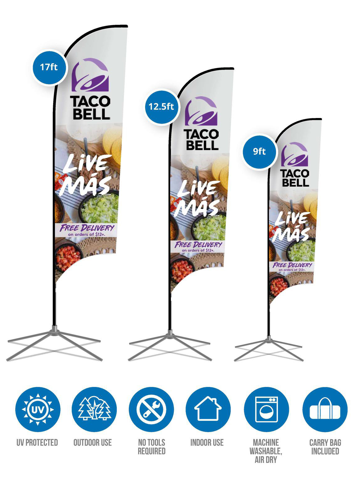 Available in single and double sided. Sizes: 9ft, 12.5ft & 17ft.
